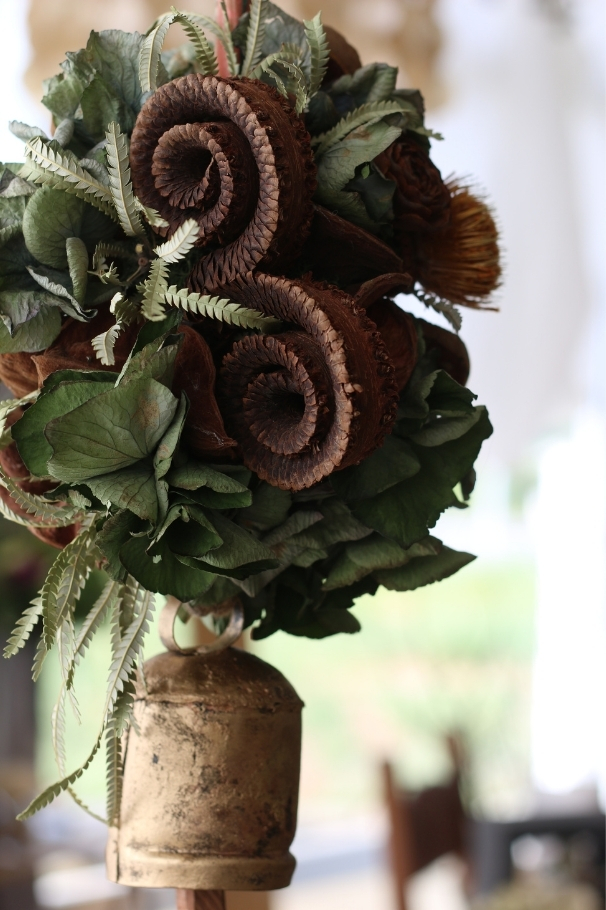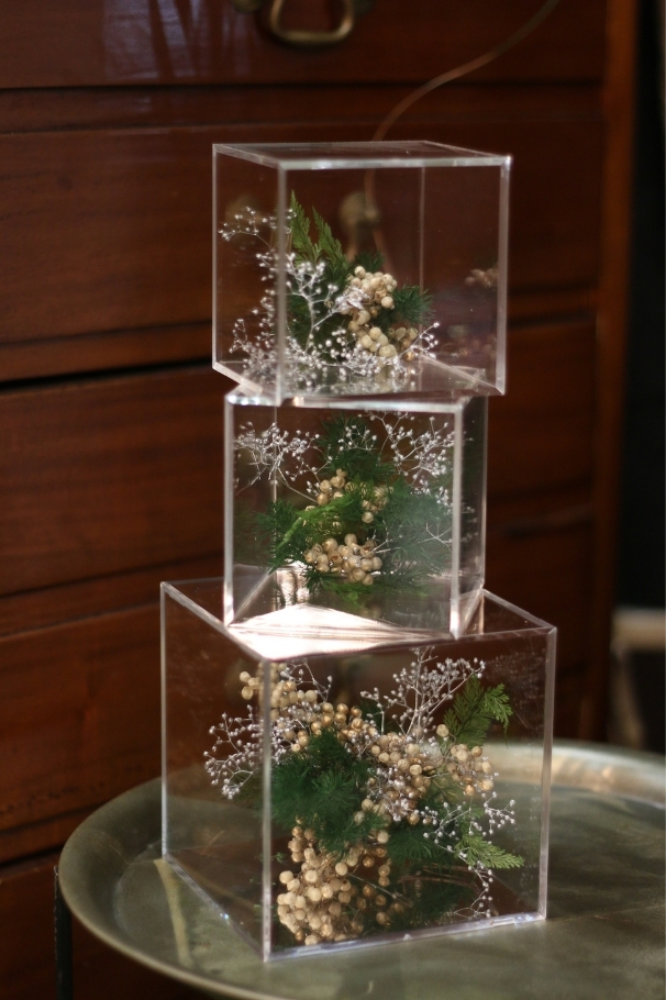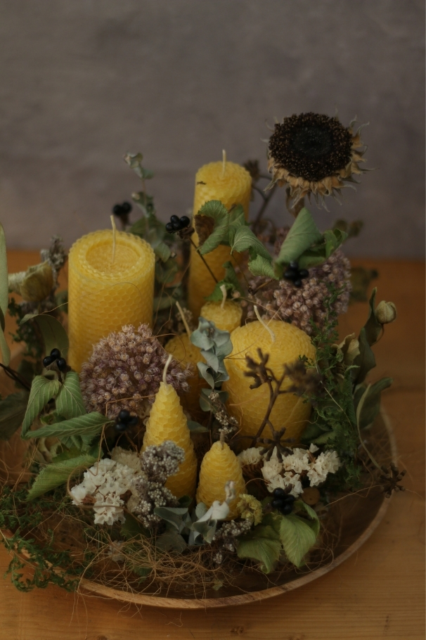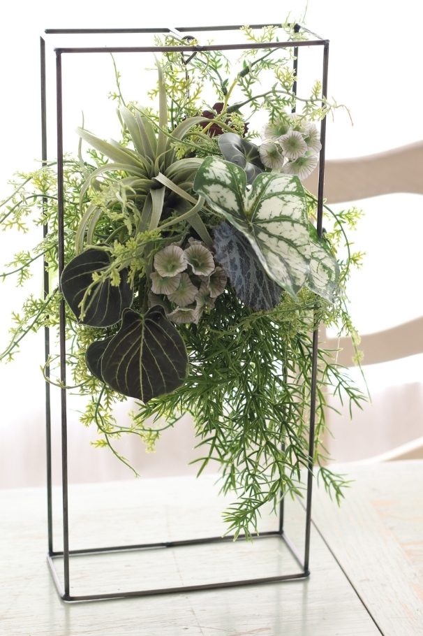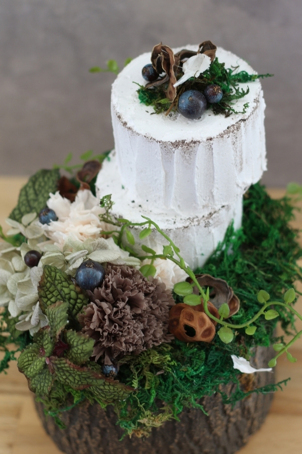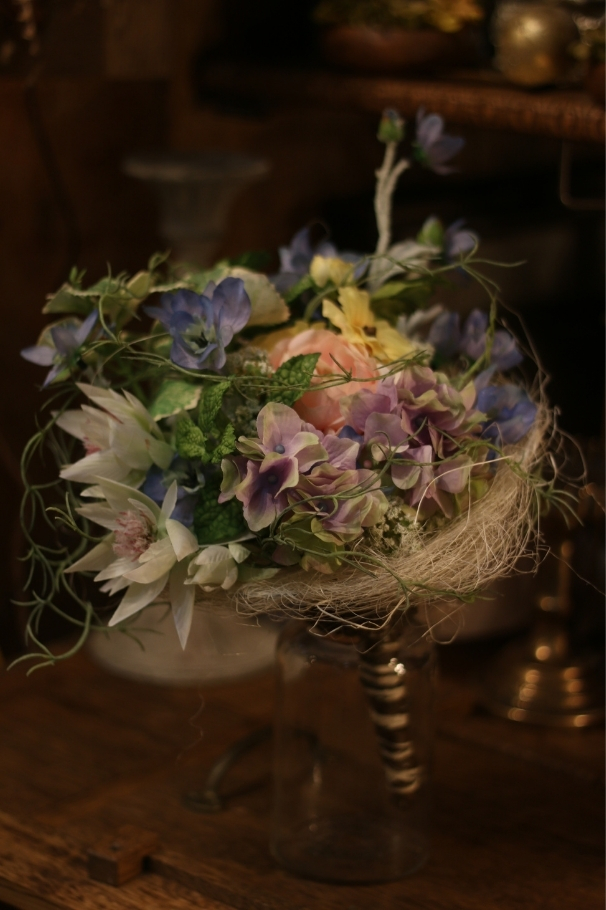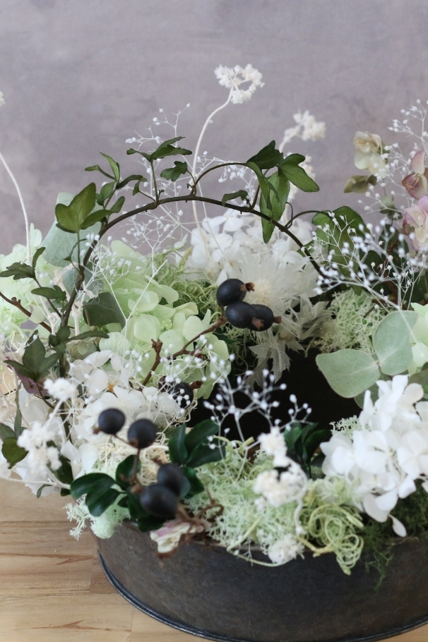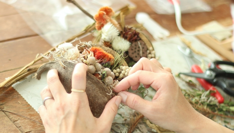生花以外の花材に生き生きとした命を吹き込むよう制作します。ずっと眺めていたくなるような物語を感じる作品作りは、自分だけの世界を作る楽しみを感じられるレッスンです。